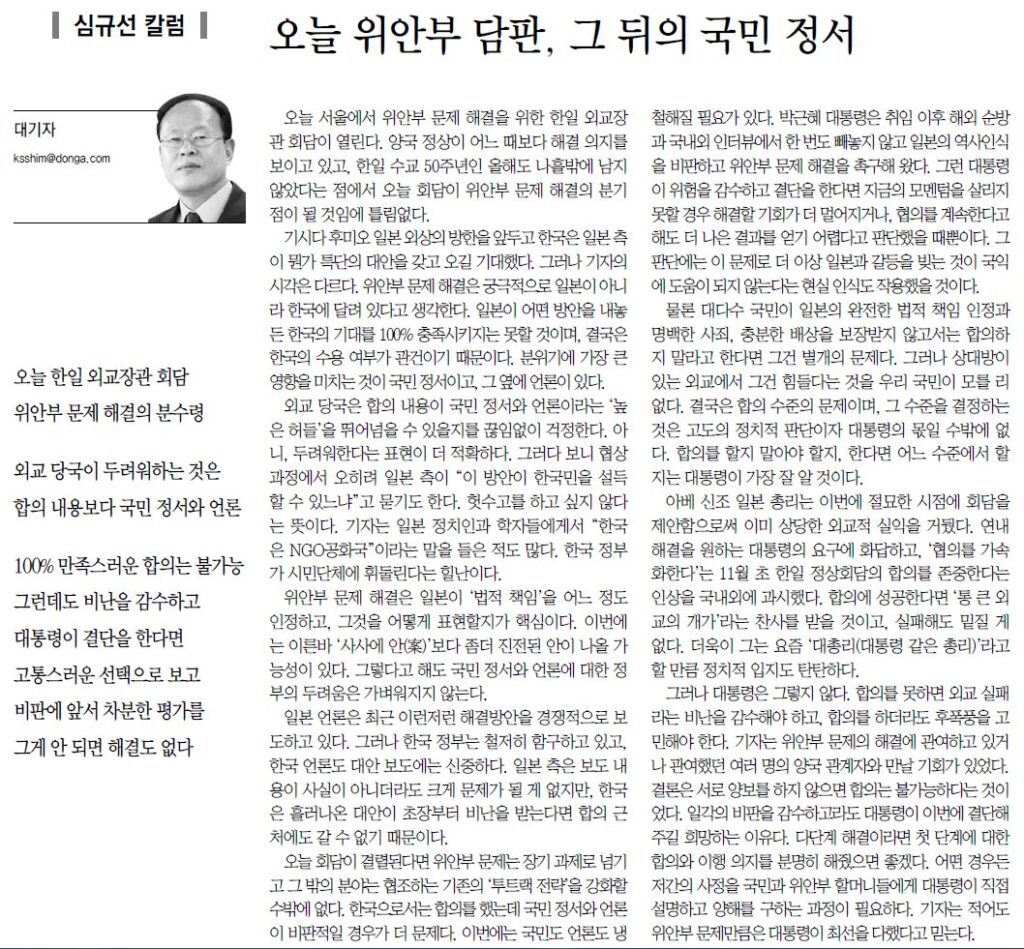 오늘 위안부 담판, 그 뒤의 국민정서 -심규선 대기자